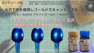 ガイア メタリックカラー ガイアカラー No.010 ブライトゴールド Bright Gold + No.044 クリアーブルー Clear Blueを3種類の光沢下地にキャンディー塗装して比較してみた。