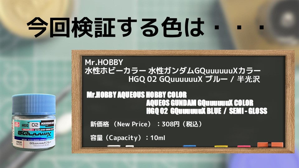 今回比較検証する塗料は、Mr. ボビー 水性ガンダム GQuuuuuuXカラー HGQ 02 GQuuuuuuX ブルーです。