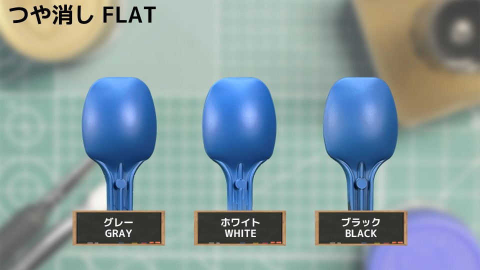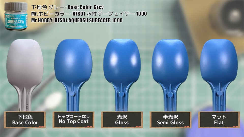 比較方法ですが、プラスチックスプーンに、3種類のサーフェイサーを吹き、その上からMr.カラーの 水性ガンダム GQuuuuuuXカラーを吹いて行きます。