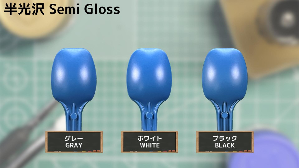 半光沢は、本来の塗料の半光沢より 艶の差が有りますが、色合いは少し濃いさを感じますが 鮮やかさが有り 落ち着いた感じの良い色合いだと思います。