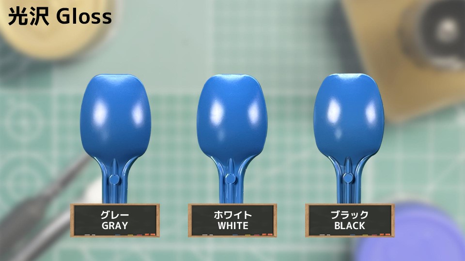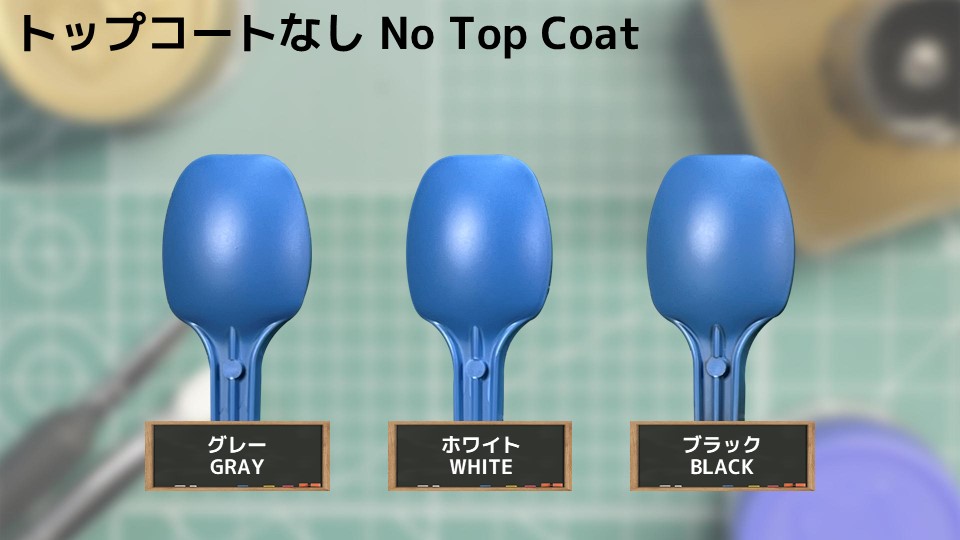 そのあとに、光沢、半光沢、つや消しの、3種類のトップコートでコーティングした物と、トップコートなしを用意して、それぞれを比較します。