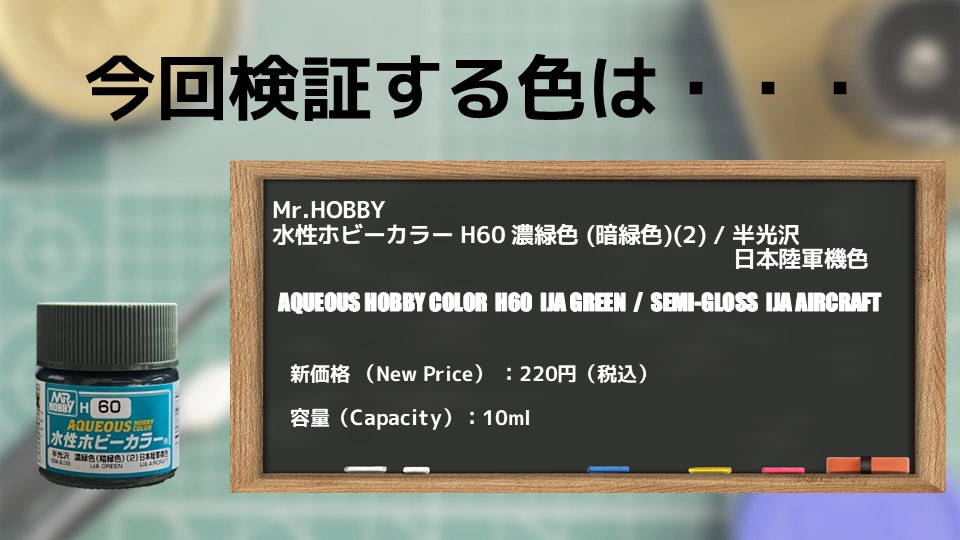今回比較検証する塗料は、Mr. ボビー 水性ホビーカラー H60 濃緑色 (暗緑色) (2) です。