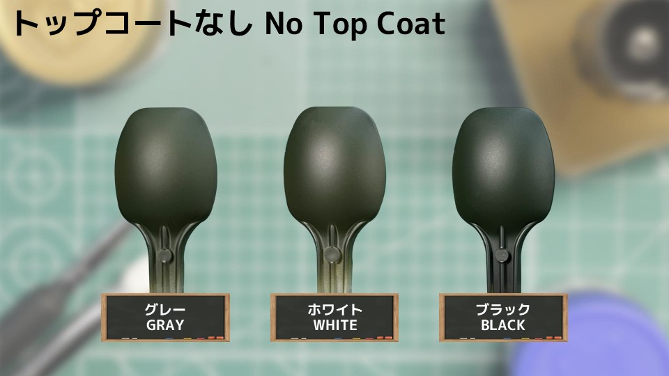 そのあとに、光沢、半光沢、つや消しの、3種類のトップコートでコーティングした物と、トップコートなしを用意して、それぞれを比較します。