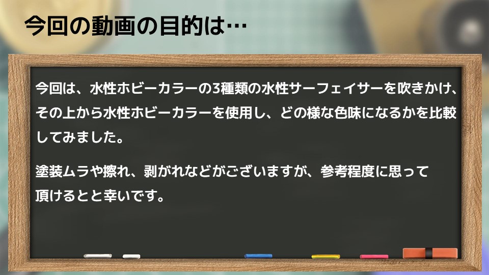 今回の動画の目的ですが、水性ホビーカラーの3種類の水性サーフェイサーを吹きかけ、その上から水性ホビーカラーを使用し、どの様な色味になるかを比較してみました。