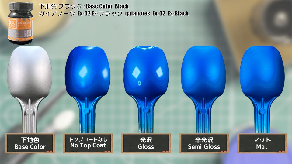 最終仕上に、光沢、半光沢、つや消しの、3種類のトップコートでコーティングした物と、トップコートなしを用意して、それぞれを比較します。
