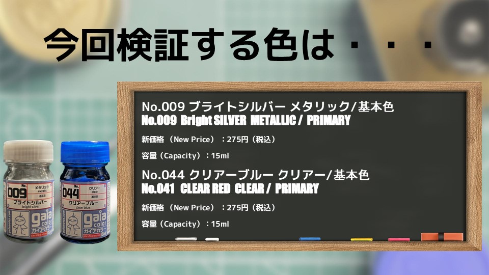 今回比較検証する塗料は、ガイアカラー No.009 ブライトシルバー + No.041 クリアーレッドです。