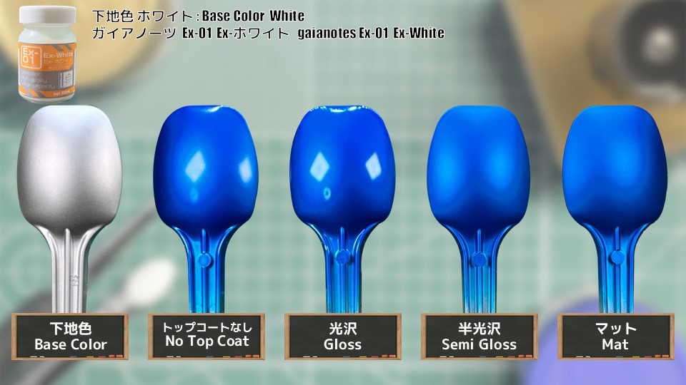 Mr.カラーのカラークリアーと比較すると、Mr.カラーでは少し乾燥してからの重ね吹きを行って今回の色合い近くが出ましたが、ガイアカラーのクリアーでは、乾燥の時間を取らずに 塗装しても 今回の検証の色合い程度の綺麗なブルーの色合いが出ていました。