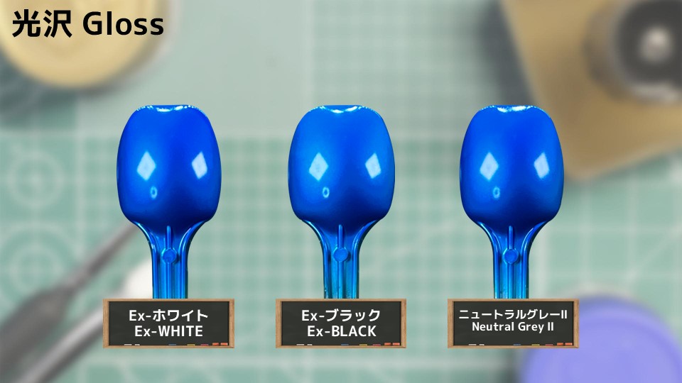 比較前に、今回の塗料の希釈率ですが、環境などの条件や、エアブラシ、エアー圧の個人差などが有りますが、今回は、Exホワイト・Exブラック・ニュートラルグレーⅡ、クリアーは、1:1~1.5未満で希釈。