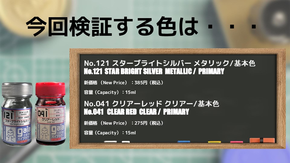 今回比較検証する塗料は、ガイアカラー No.121 スターブライトシルバー + No.041 クリアーレッドです。