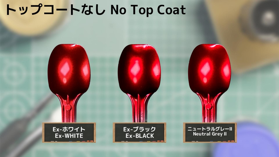 最終仕上に、光沢、半光沢、つや消しの、3種類のトップコートでコーティングした物と、トップコートなしを用意して、それぞれを比較します。