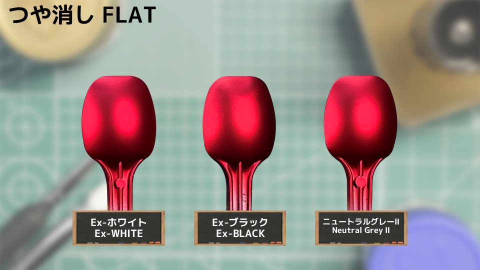 比較方法ですが、プラスチックスプーンに、Exホワイト・Exブラック・ニュートラルグレーⅡを吹き、その上からブライトシルバーを吹いて行きます。