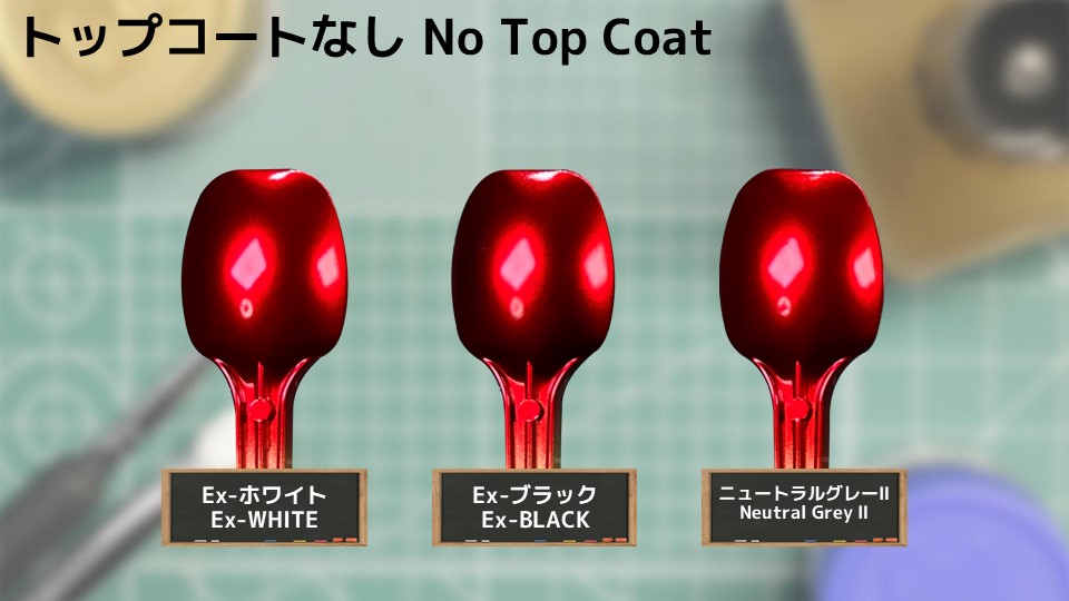最終仕上に、光沢、半光沢、つや消しの、3種類のトップコートでコーティングした物と、トップコートなしを用意して、それぞれを比較します。