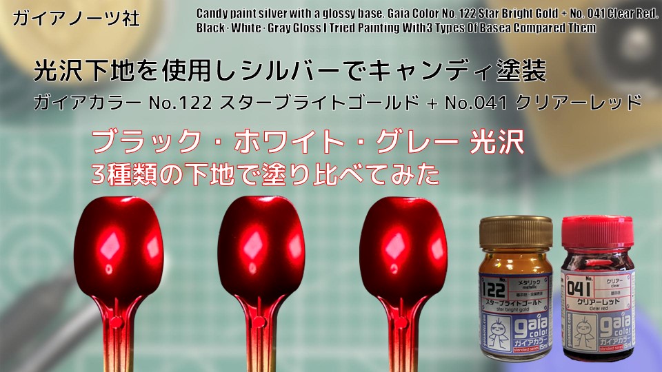 Candy paint silver with a glossy base. Gaia Color No.122 Star Bright Gold + No.041 Clear Red . Black・White・Gray Gloss I Tried Painting With3 TypesOfBasea Compared Them.