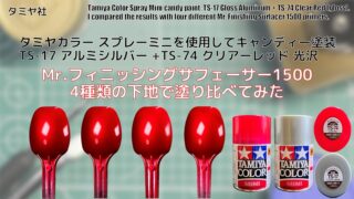 タミヤ タミヤカラー スプレーミニのTS-17 アルミシルバー + TS-74 クリアーレッドを使用してキャンディー塗装を4種類の下地で塗り比べてみた。