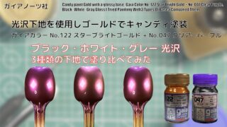 ガイア メタリックカラー ガイアカラー No.122 スターブライトゴールド Star Bright Gold + No047 クリアーパープル Clear Purpleを3種類の光沢下地にキャンディー塗装して比較してみた。 Candy paint silver with a glossy base. Gaia Color No.122 Star Bright Gold + No.047 Clear Purple . Black・White・Gray Gloss... 2026.02.04 ガイア メタリックカラーガイア 基本カラーガイアノーツキャンディ塗装