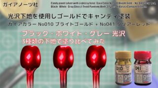 ガイア メタリックカラー ガイアカラー No.010 ブライトゴールド Bright Gold + No.041 クリアーレッド Clear Redを3種類の光沢下地にキャンディー塗装して比較してみた。
