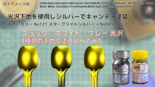 ガイア メタリックカラー ガイアカラー No.121 スターブライトシルバー Star Bright Silver + No.045 クリアーイエロー Clear Yellowを3種類の光沢下地にキャンディー塗装して比較してみた。