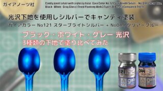 ガイア メタリックカラー ガイアカラー No.121 スターブライトシルバー Star Bright Silver + No.044 クリアーブルー Clear Blueを3種類の光沢下地にキャンディー塗装して比較してみた。