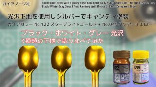 ガイア メタリックカラー ガイアカラー No.122 スターブライトゴールド Star Bright Gold + No.045 クリアーイエロー Clear Yellowを3種類の光沢下地にキャンディー塗装して比較してみた。