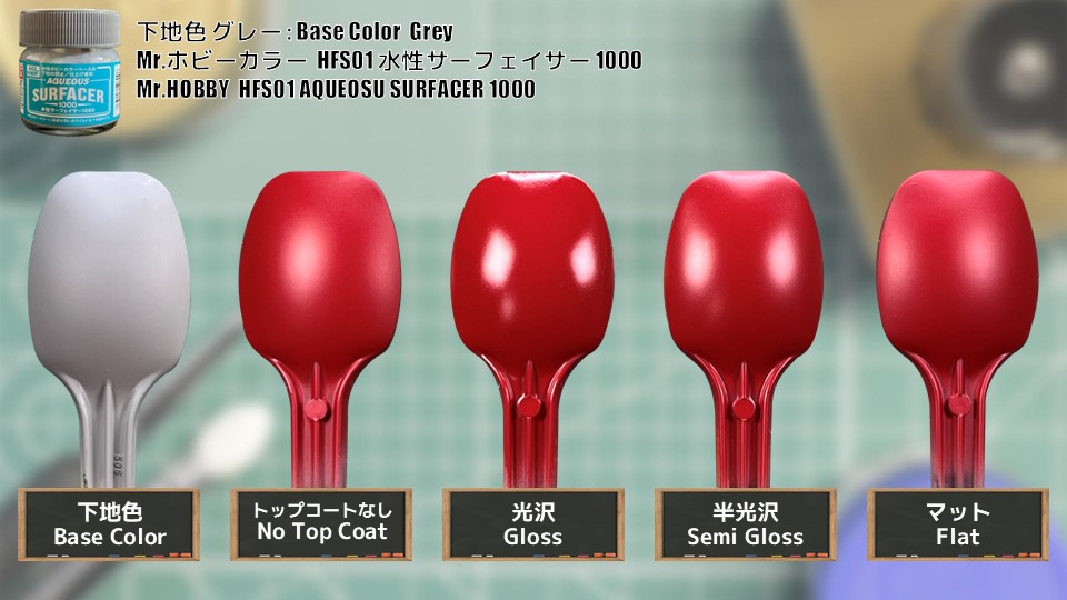 今回のMr.ホビー 水性ホビーカラー 水性ガンダムジークアクスカラー HGQ04 GQuuuuuuXレッドを3種類のサーフェイサーで検証してみましたが、それぞれの下地毎の色合い表現が出ていましたが感じの良い 綺麗で鮮やかさがある、それぞれの濃さのレッドの色合いが出ていると思いました。