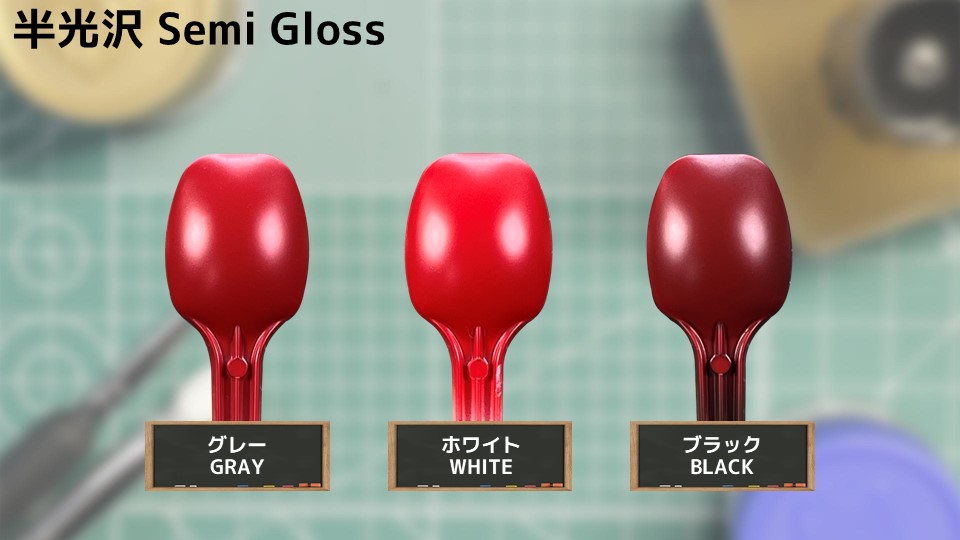 半光沢は、本来の塗料の半光沢より 艶の差が有りますが、色合いは少し濃いさを感じますが 鮮やかさが有り 落ち着いた感じの良い色合いだと思います。