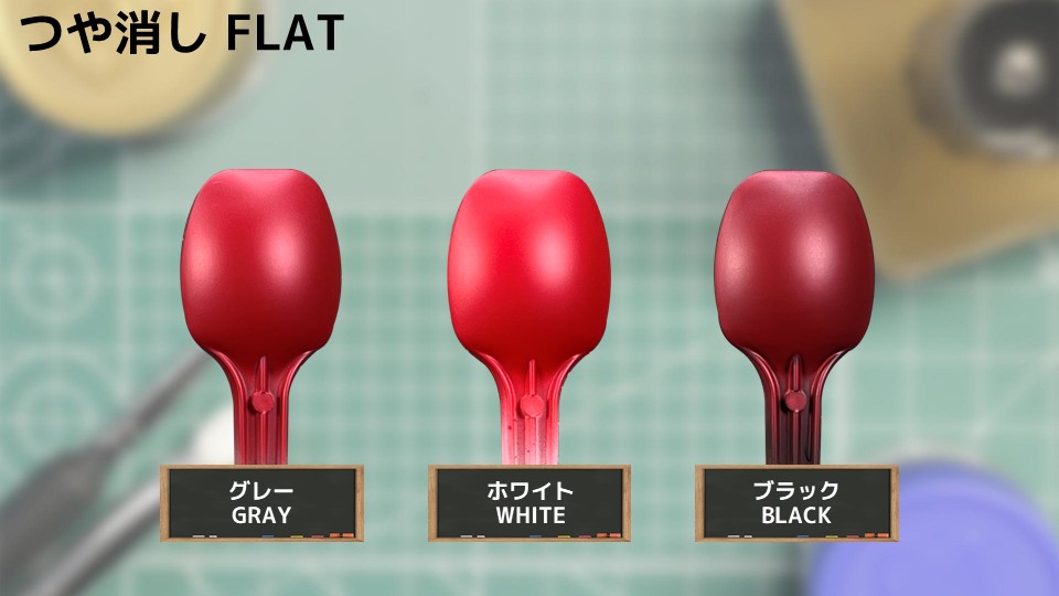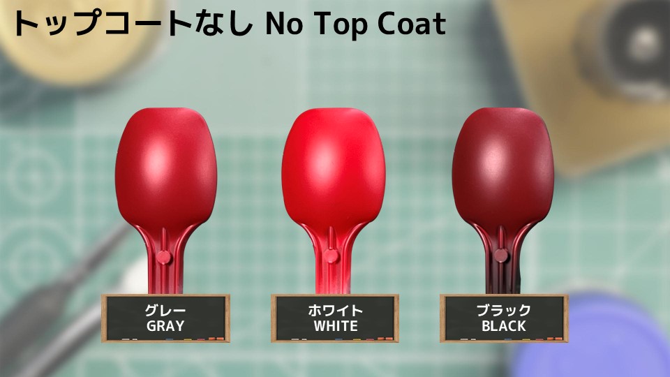 そのあとに、光沢、半光沢、つや消しの、3種類のトップコートでコーティングした物と、トップコートなしを用意して、それぞれを比較します。
