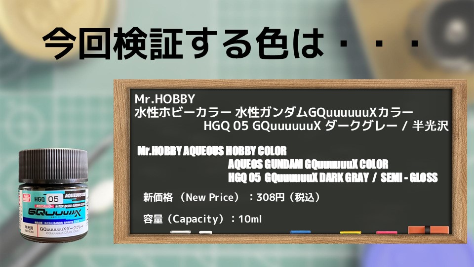 今回比較検証する塗料は、Mr. ボビー 水性ガンダム GQuuuuuuXカラー HGQ 05 GQuuuuuuX ダークグレーです。