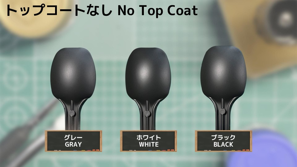 そのあとに、光沢、半光沢、つや消しの、3種類のトップコートでコーティングした物と、トップコートなしを用意して、それぞれを比較します。