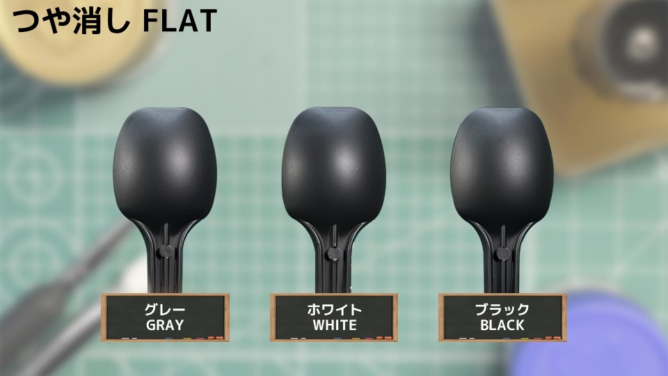比較方法ですが、プラスチックスプーンに、3種類のサーフェイサーを吹き、その上からMr.カラーの 水性ガンダム GQuuuuuuXカラーを吹いて行きます。