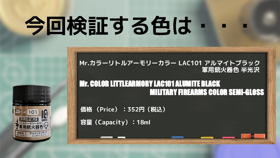 今回比較検証する塗料は、Mr.カラー リトルアーモリーカラー LAC101 アルマイトブラック 軍用銃火器色です。
