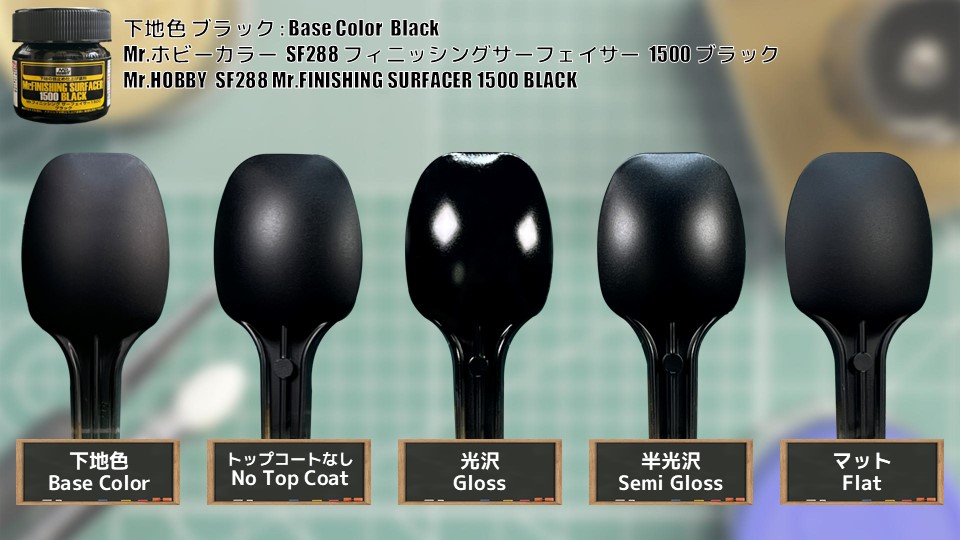 今回の塗料、Mr.カラー リトルアーモリーカラー LAC101 アルマイトブラックは、半光沢塗料になりますが、それぞれ下地の影響は感じられませんでしたが、多少の明るさの差は有り、それぞれのトップコートでは 色合いの深みや重みを感じられる ブラックの色合いが 出ていると思いました。