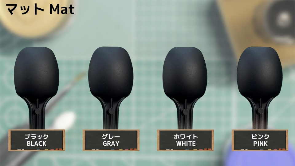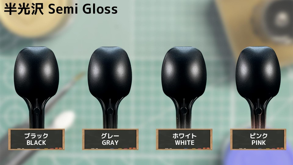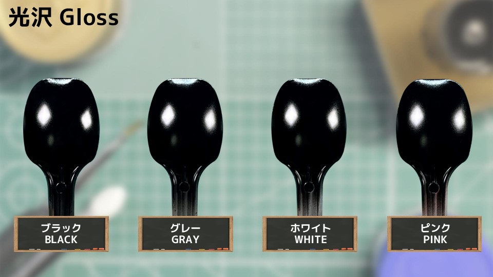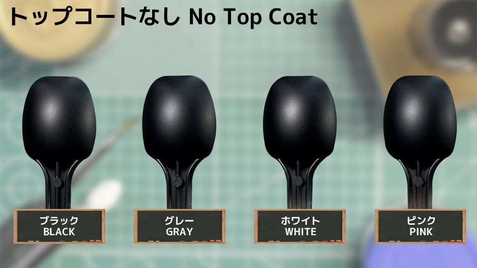 仕上に、光沢、半光沢、つや消しの、3種類のトップコートでコーティングした物と、トップコートなしを用意して、それぞれを比較します。