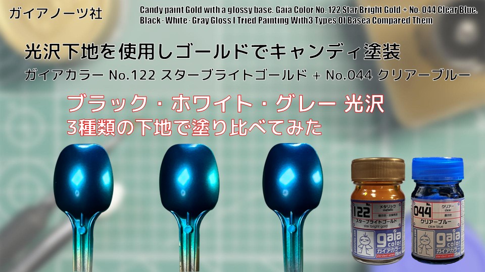 Candy paint silver with a glossy base. Gaia Color No.122 Star Bright Gold + No.044 Clear Blue . Black・White・Gray Gloss I Tried Painting With3 TypesOfBasea Compared Them.