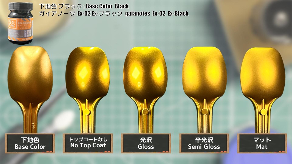 今回は、ガイアカラーのExホワイト・Exブラック・ニュートラルグレーⅡを吹きかけ、光沢下地として使用し、また メタリックカラーの下地としては、ガイアカラーのスターブライトゴールドを塗装し、キャンディ塗装を行う為に、ガイアカラーのクリアーカラーを吹いて、どの様な色味になるかを比較してみました。