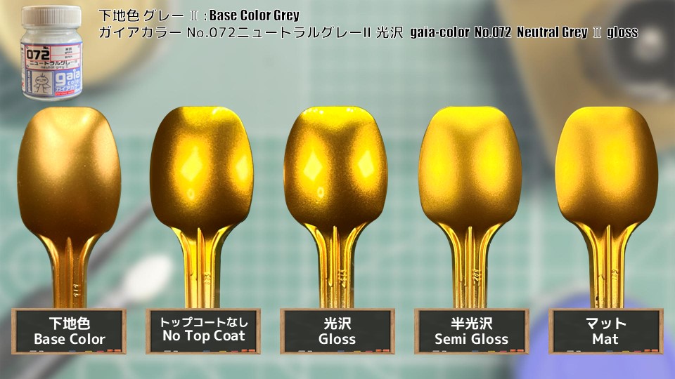 次は、下地がガイアカラー No.072 ニュートラルグレーⅡでNo.122 スターブライトゴールドを塗装したものですです。