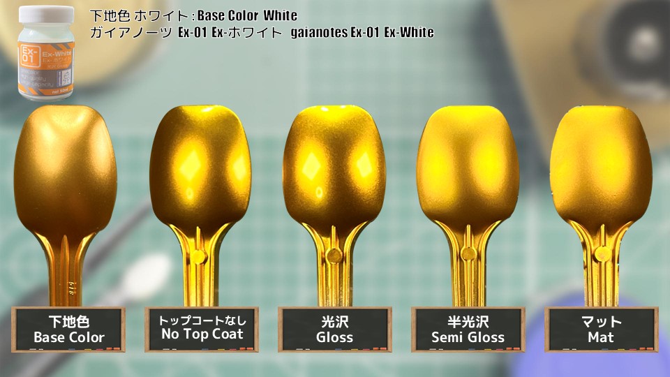 先ずは、下地がガイアノーツ Ex-01 ExホワイトでNo.122 スターブライトゴールドを塗装したものです。