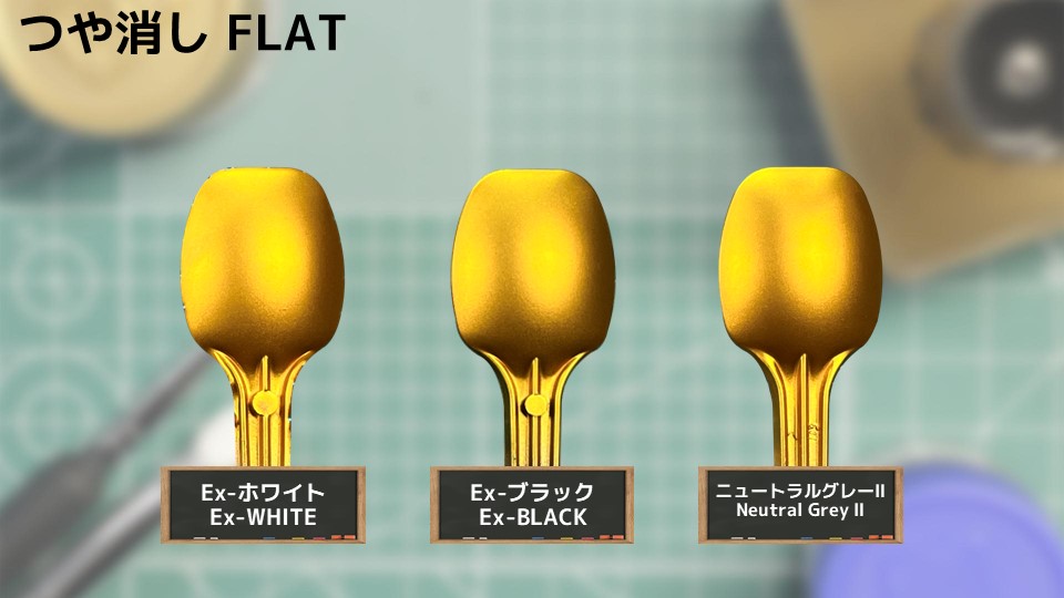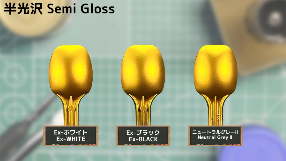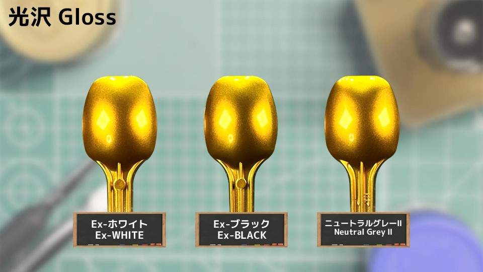 ガイアカラーのEx-01 Exホワイト Ex-02 Exブラック No.072 ニュートラルグレーⅡを塗装後に「ガイアカラー No.122 スターブライトゴールド + No.045 クリアーイエロー」を塗装してみました。