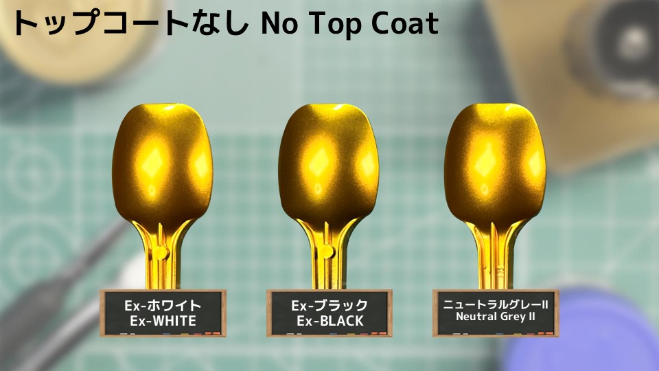 最終仕上に、光沢、半光沢、つや消しの、3種類のトップコートでコーティングした物と、トップコートなしを用意して、それぞれを比較します。