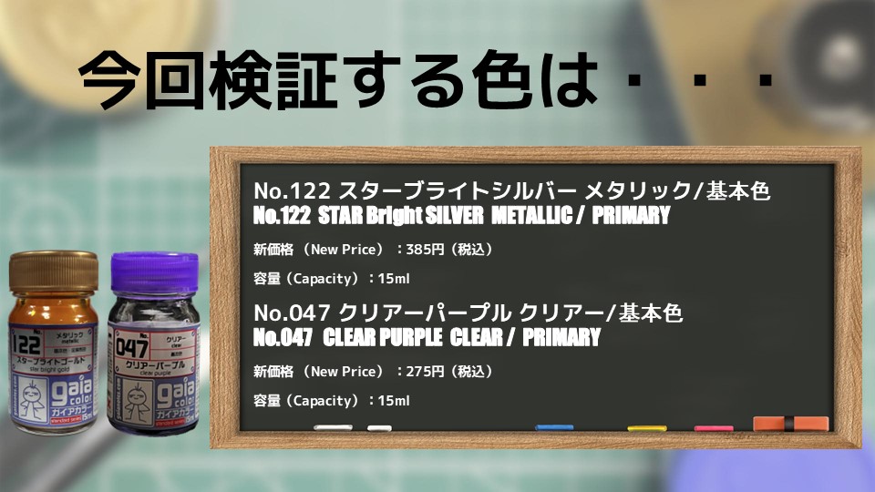 今回比較検証する塗料は、ガイアカラー No.122 スターブライトゴールド + No047 クリアーパープルです。