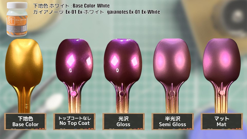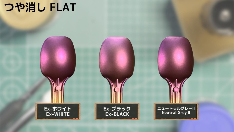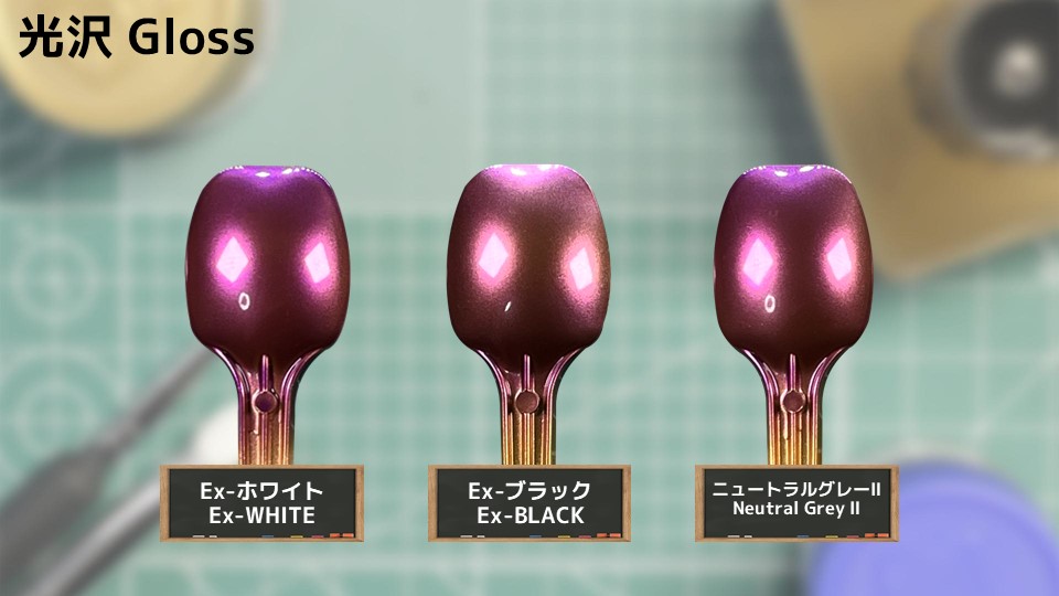 ガイアカラーのEx-01 Exホワイト Ex-02 Exブラック No.072 ニュートラルグレーⅡを塗装後に「ガイアカラー No.122 スターブライトゴールド + No047 クリアーパープル」を塗装してみました。