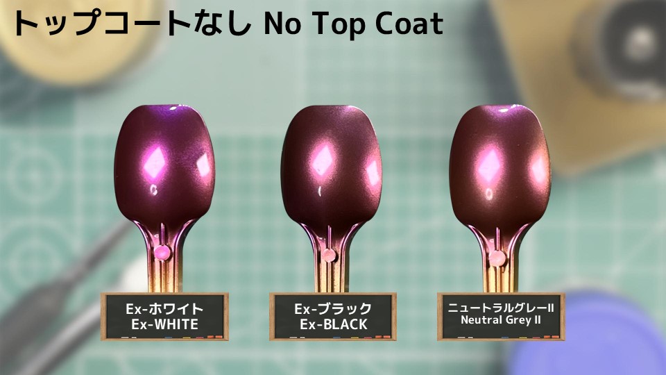 以上が、それぞれの下地と トップコート別の色合いを検証した結果になります。