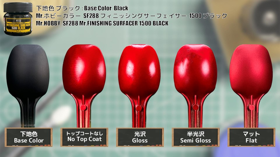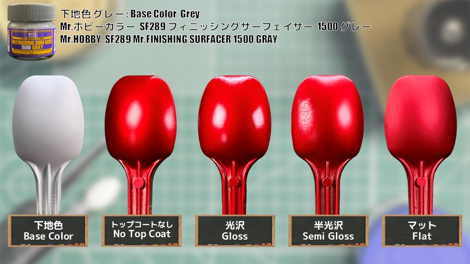 最終仕上に、タミヤスプレー缶の光沢、半光沢、つや消しの、3種類のトップコートでコーティングした物と、トップコートなしを用意して、それぞれを比較します。