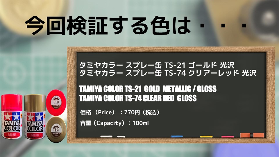 今回比較検証する塗料は、タミヤカラー スプレーミニのTS-21 ゴールド + TS-74 クリアーレッドです。