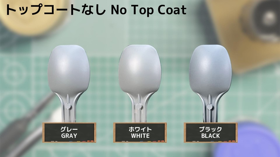 そのあとに、光沢、半光沢、つや消しの、3種類のトップコートでコーティングした物と、トップコートなしを用意して、それぞれを比較します。