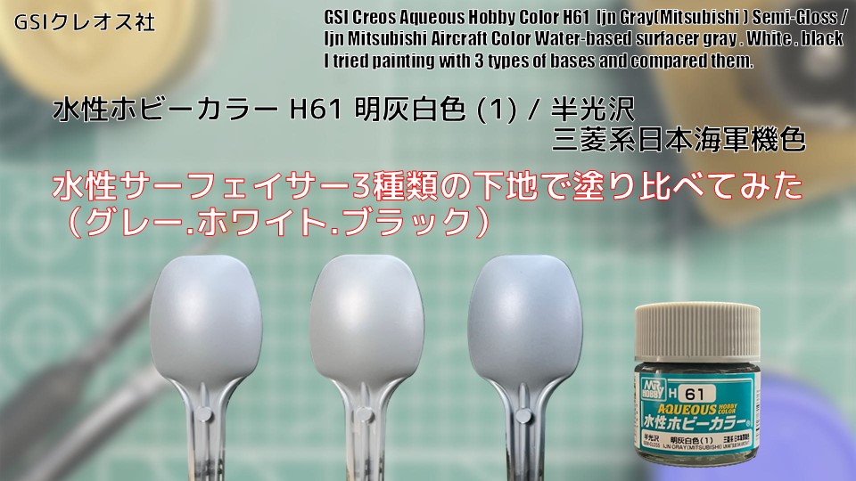 GSI Creos Aqueous Hobby Color H61 Ijn Gray(Mitsubishi ) Semi-Gloss / Ija Aircraft Color Water-based surfacer gray . White . black I tried painting with 3 types of bases and compared them.